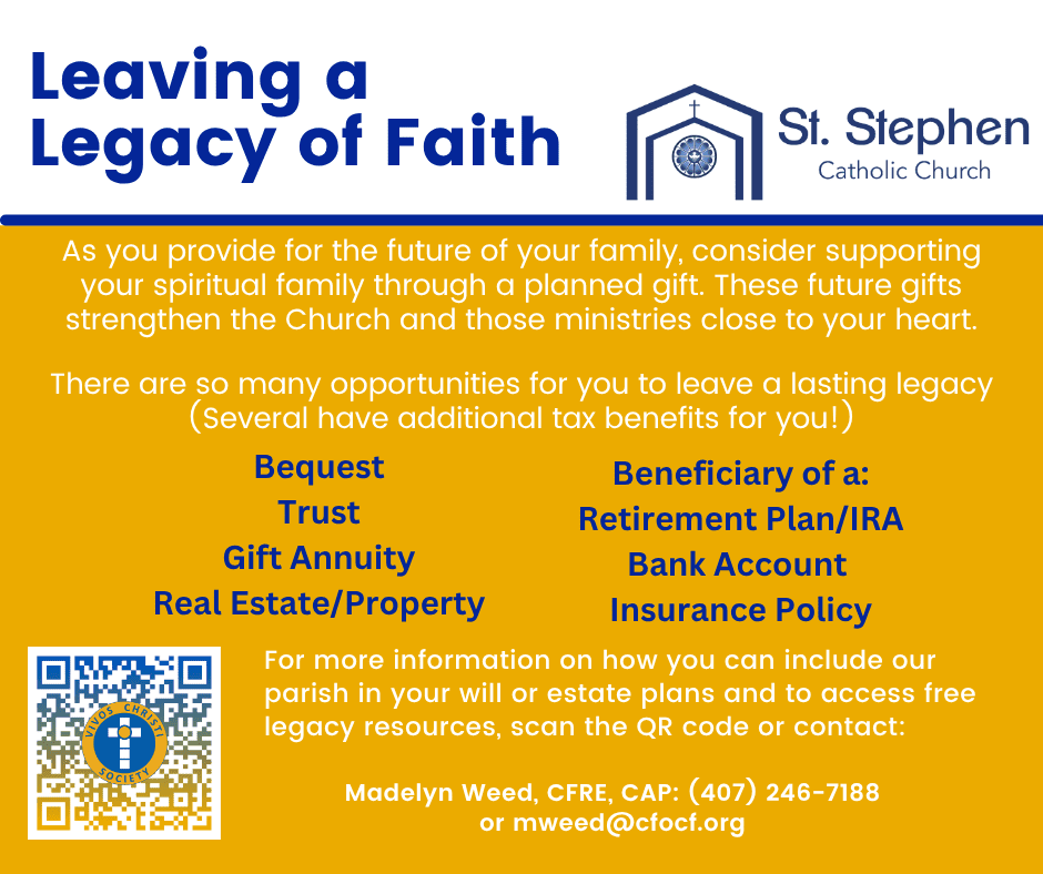 You can help support St. Stephen Catholic Church through other means of giving. These opportunities allow you to plan out how you wish to give outside of the regular collections.