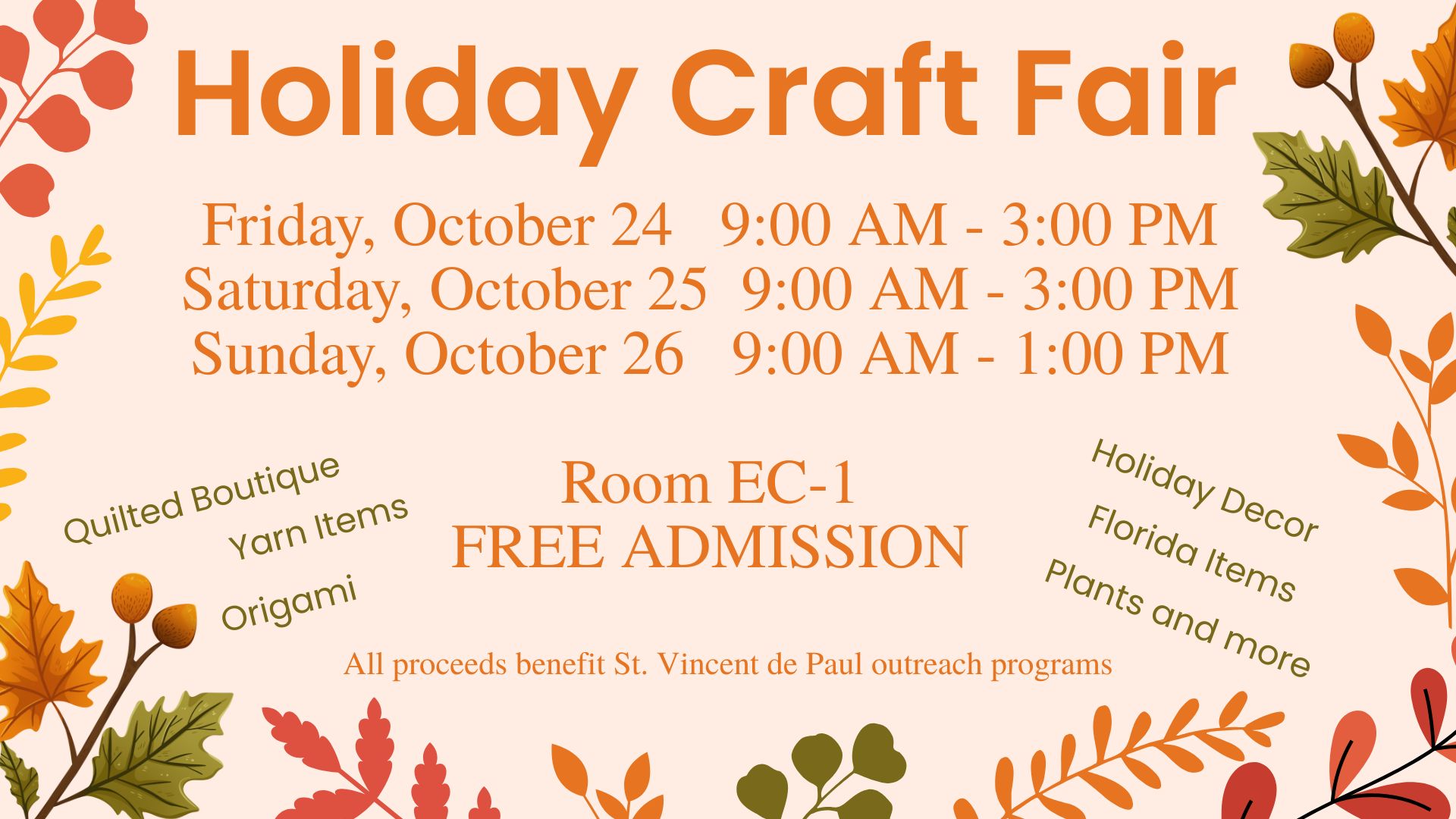 Arts and Crafts Fair: The St. Stephen Annual Arts and Crafts Holiday Sale will be held in EC-1 on the campus of St. Stephen Catholic Church, 575 Tuskawilla Road, Winter Springs on Friday and Saturday, October 24 and 25, from 9-3, and on Sunday, October 26, from 9-1. Most sale items are handcrafted by members of the Arts and Crafts Ministry and include floral and holiday decor, kitchen items, a quilt boutique, teacher gifts, plants, collegiate items, baby and children’s items, yarn items, Florida and beach décor, a group of gifts priced $5 and under, and many other unique gifts. There are no commercial vendors. All proceeds go to St. Vincent de Paul Outreach. Admission is FREE. Additionally, the Christmas Craft Shoppe will be open in EC-1 every Sunday and Tuesday in November from 9:30 -1:30.
